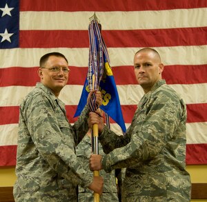 The 1st Special Operations Security Forces Squadron held a change of command ceremony at the Soundside Club on Hurlburt Field, Fla., July 12. Lt. Col. Kirk Hughes passed the 1st SOSFS guidon to Col. Douglas Dudley, 1st Special Operations Mission Support Group commander, who then presented the guidon