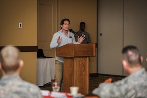Mr. Martin King, community readiness consultant with the Airman and Family Readiness Center, speaks to guests during an Air Force Assistance Fund breakfast at Hurlburt Field, Fla., March 17, 2016. The AFAF raises money for charitable affiliates that provide support to Air Force families in need. The