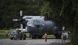 Airmen with the 1st Special Operations Wing lower an MC-130P Combat Shadow after removing both wings on Hurlburt Field, Fla., Aug. 5, 2015. The MC-130P Combat Shadow, “Team Shadow,” and an AC-130H Specter, “Wicked Wanda,” were towed to the Hurlburt Field Air Park Aug. 15, 2015. (U.S. Air Force photo