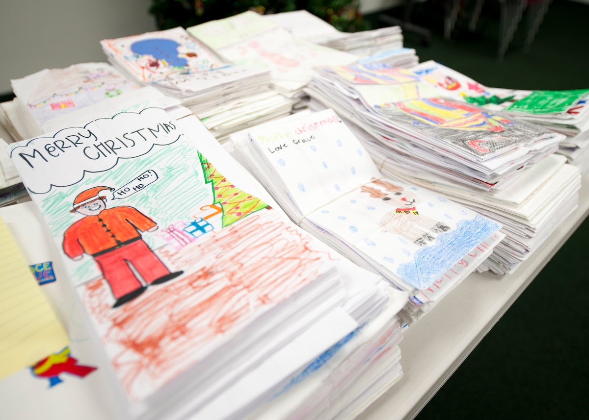 More than 1,200 cookies bags lay ready for filling during the preparations for the annual Commando Cookie Drop on Hurlburt Field, Fla., Dec. 17, 2012. The bags were decorated by local elementary school students and were used to deliver more than 15,000 cookies to young Airmen throughout the base. (U.S. photo by Senior Airman Kentavist P. Brackin)