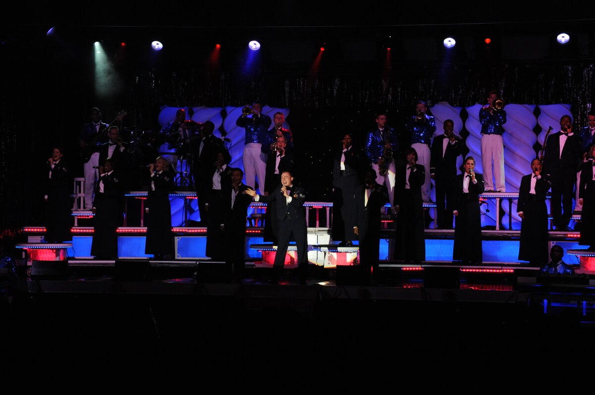 Staff Sgt. Harron Elloso, a Tops in Blue vocalist, left, dances with Tech. Sgt. Katie Badowski, a Tops in Blue vocalist dressed as Lady GaGa, during a concert at the 16th AMU Hangar at Hurlburt Field, Fla., March 11, 2011. Sergeant Elloso is a services journeyman assigned to the 633rd Force Support Squadron at Langley Air Force Base, Va., and Sergeant Badowski is a services craftsman assigned to the 446th Services Flight at McChord Air Force Base, Wash. (U.S. Air Force photo by Airman 1st Class Caitlin O’Neil-McKeown / RELEASED)