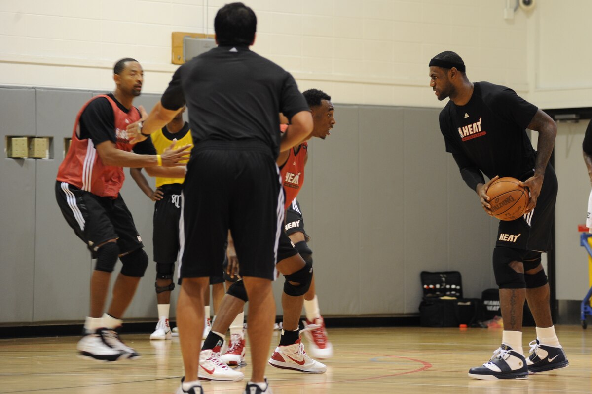 Erik Spoelstra, Miami HEAT head coach, is interviewed by Tech. Sgt Pete Blanding, 1st Special Operations Wing Public Affairs broadcaster during the Miami HEAT 2010 Training Camp at the Aderholt Fitness Center, Hurlburt Field, Fla., Sept. 29, 2010. The team requested the use of the fitness center for their week-long training camp, and 1st Special Operations Wing leadership agreed to support the visit. (DoD photo by U.S. Air Force Staff Sgt. Stephanie Jacobs/RELEASED)