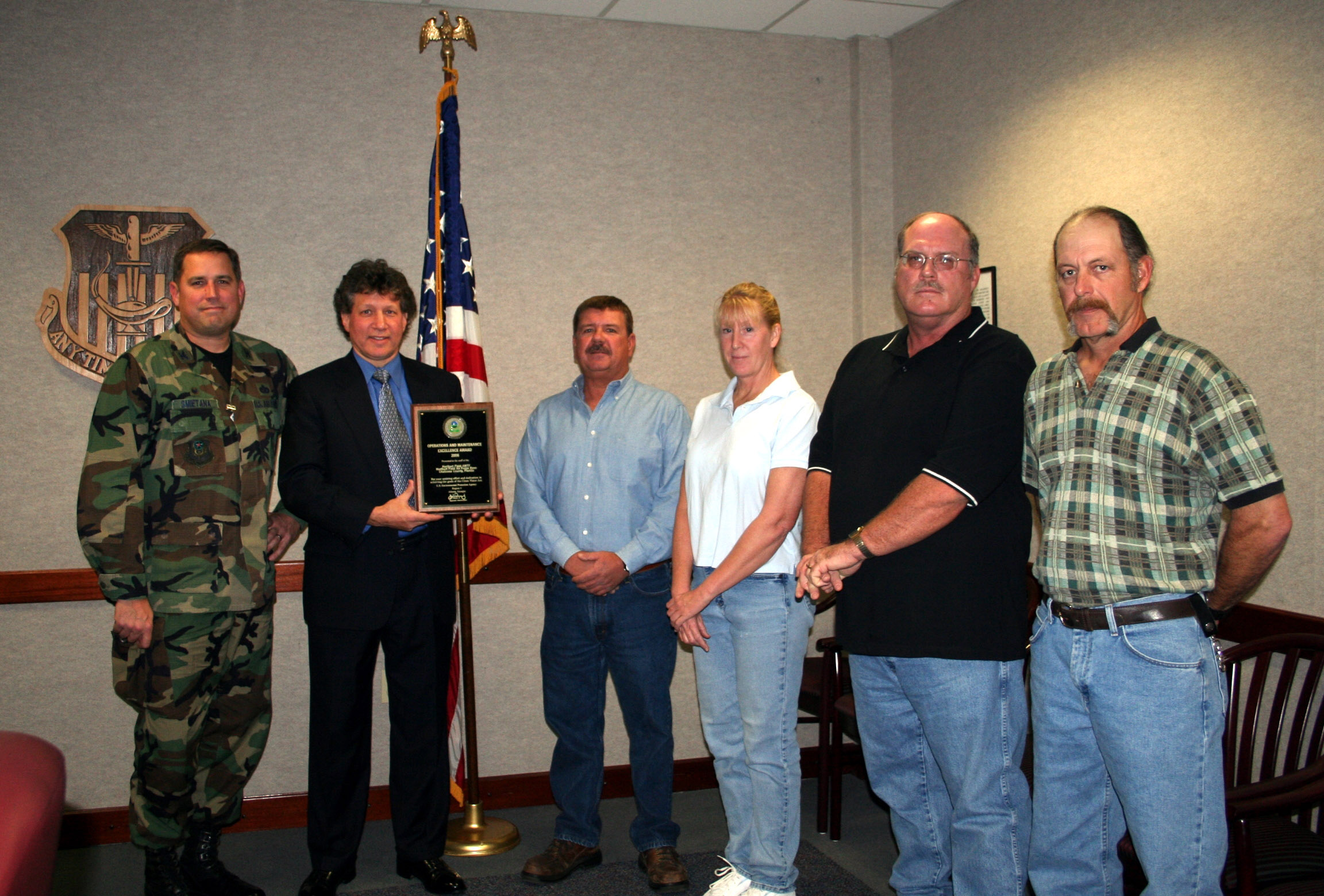 Members of the 1st Speecial Operations Civil Engineer Squadron wastewater operations plant receive the Wastewater Operations Maintenance Award. The plant won first place for EPA Region 4, and second place at the natioinal level. This is the second time the plant has received this type of recognition. In 1997, the plant won at both the EPA region 4 and EPA National level. (U.S. Air Force Photograph by SSgt Mareshah Haynes)