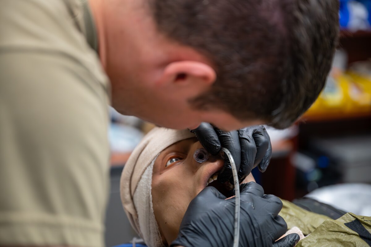 HURLBURT FIELD, Fla. -- In a dark room, the crackle of simulated gunfire and distant explosions filled the air as Airmen worked methodically to treat simulated wounds on mannequins. With only the glow of night-vision flashlights, they stabilized simulated casualties in a high-stress environment designed to replicate the chaos of combat.