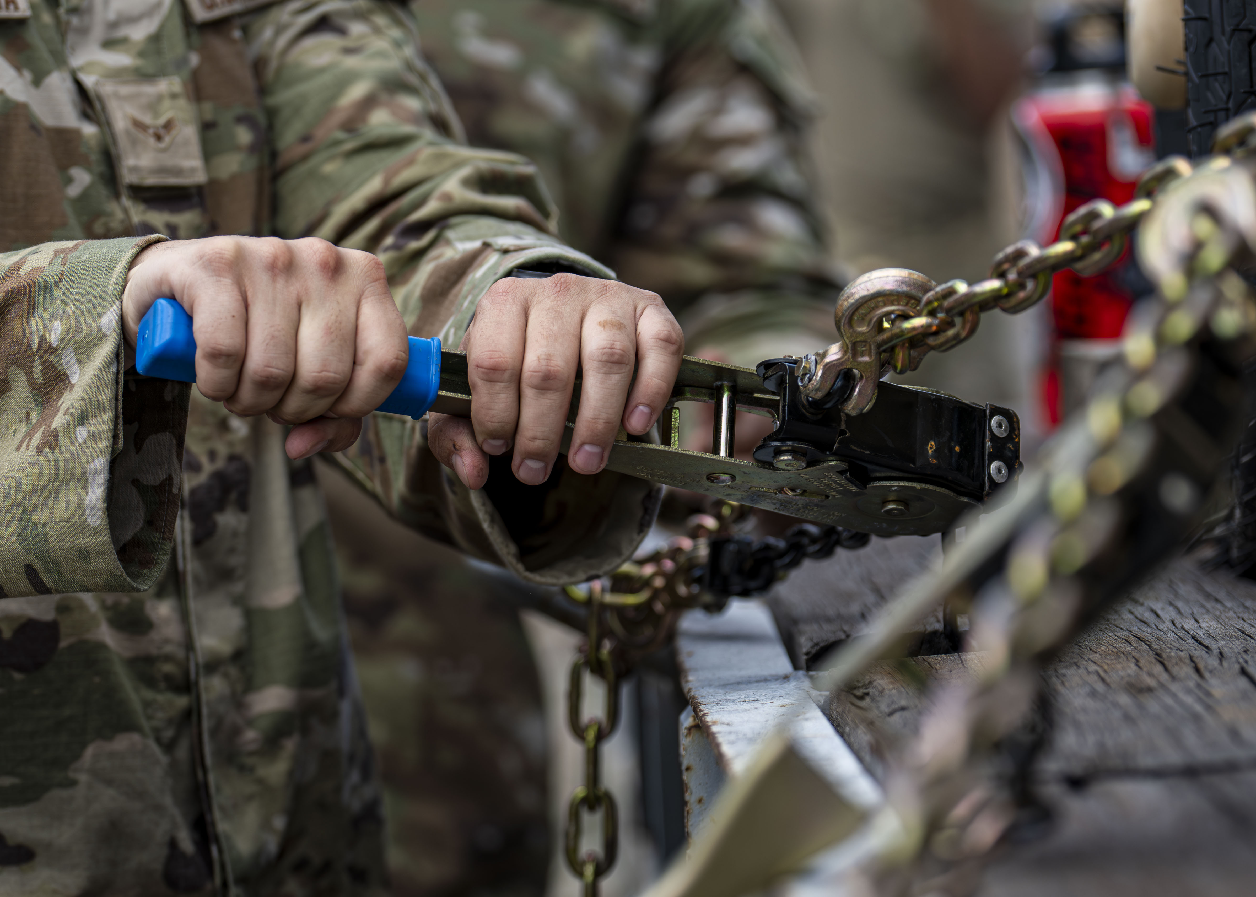 A U.S. Airman assigned to the 1st Special Operations Wing inspects a chain during Mission Ready Airmen Training at Hurlburt Field, Florida, Sept. 9, 2025. MRAT imparts the ability to properly load, secure and transport equipment, a skill critical to logistics readiness in deployed environments. (U.S. Air Force photo by Airman 1st Class Isabel Tanner)