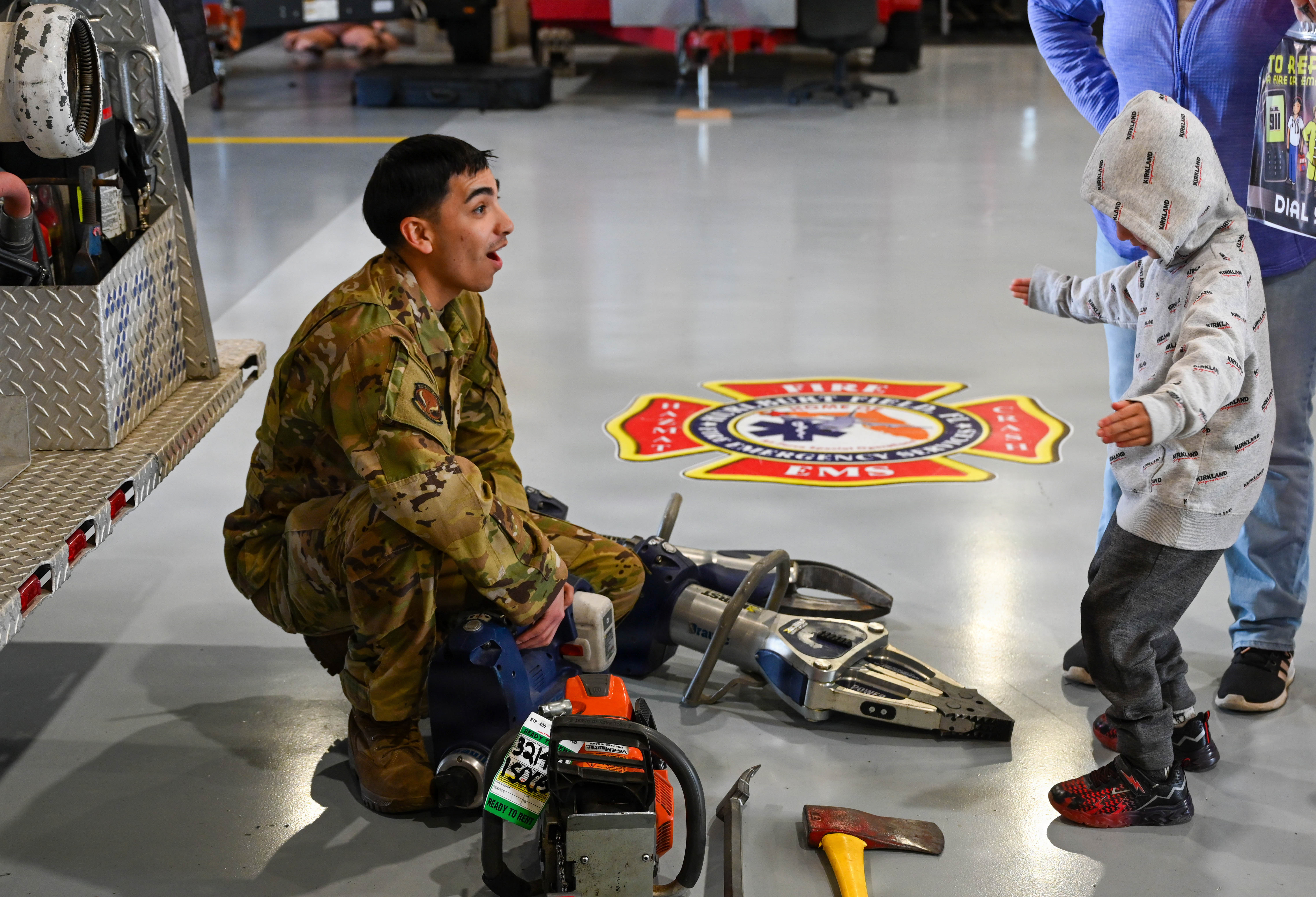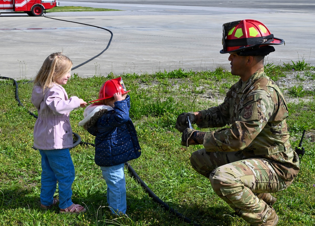 Sparky the Fire Dog interacts with children at Hurlburt Field, Florida, March 20, 2026. The Exceptional Family Member Program partnered with 1st Special Operations Wing firefighters to create an interactive experience for Air Commandos and their families to learn about fire safety. The EFMP is a mandatory enrollment program across the Department of War that focuses on establishing, implementing and maintaining comprehensive support to service members and their family members with special needs. (U.S. Air Force photo by Airman 1st Class Alexa Hunt)