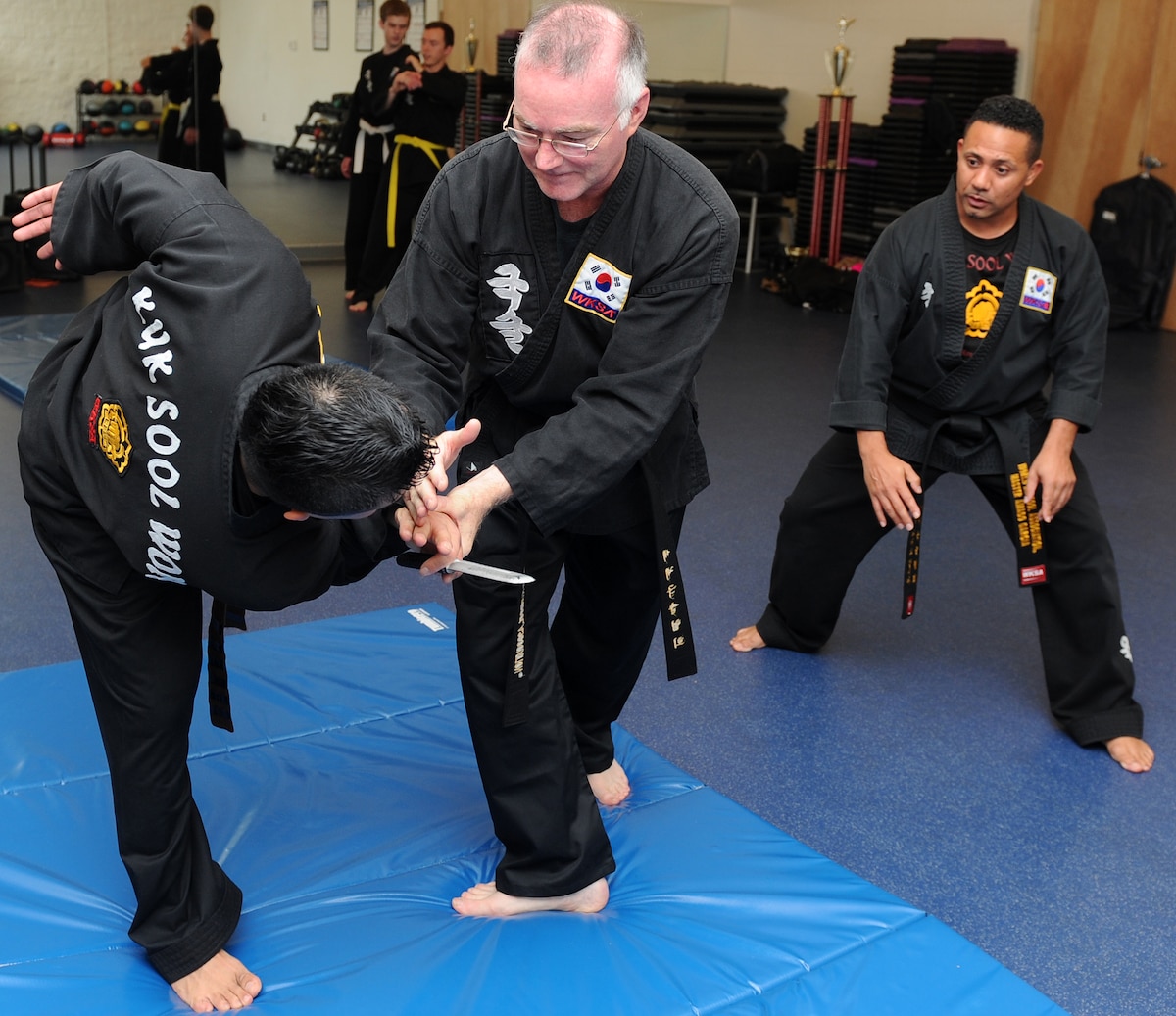 Retired Master Sgt. Amado Garcia, who was previously assigned to the 96th Aircraft Maintenance Squadron, Eglin Air Force Base, Fla., observes a student flipping during a Kuk Sool Won class at the Aderholt Gym on Hurlburt Field, Fla., Dec. 2, 2013. "When in a supervisory position, you never want to lose your cool," Garcia said. "As we know, we don't make the best decisions when angry; our thinking is clouded." (U.S. Air Force photo/Senior Airman Kentavist P. Brackin)