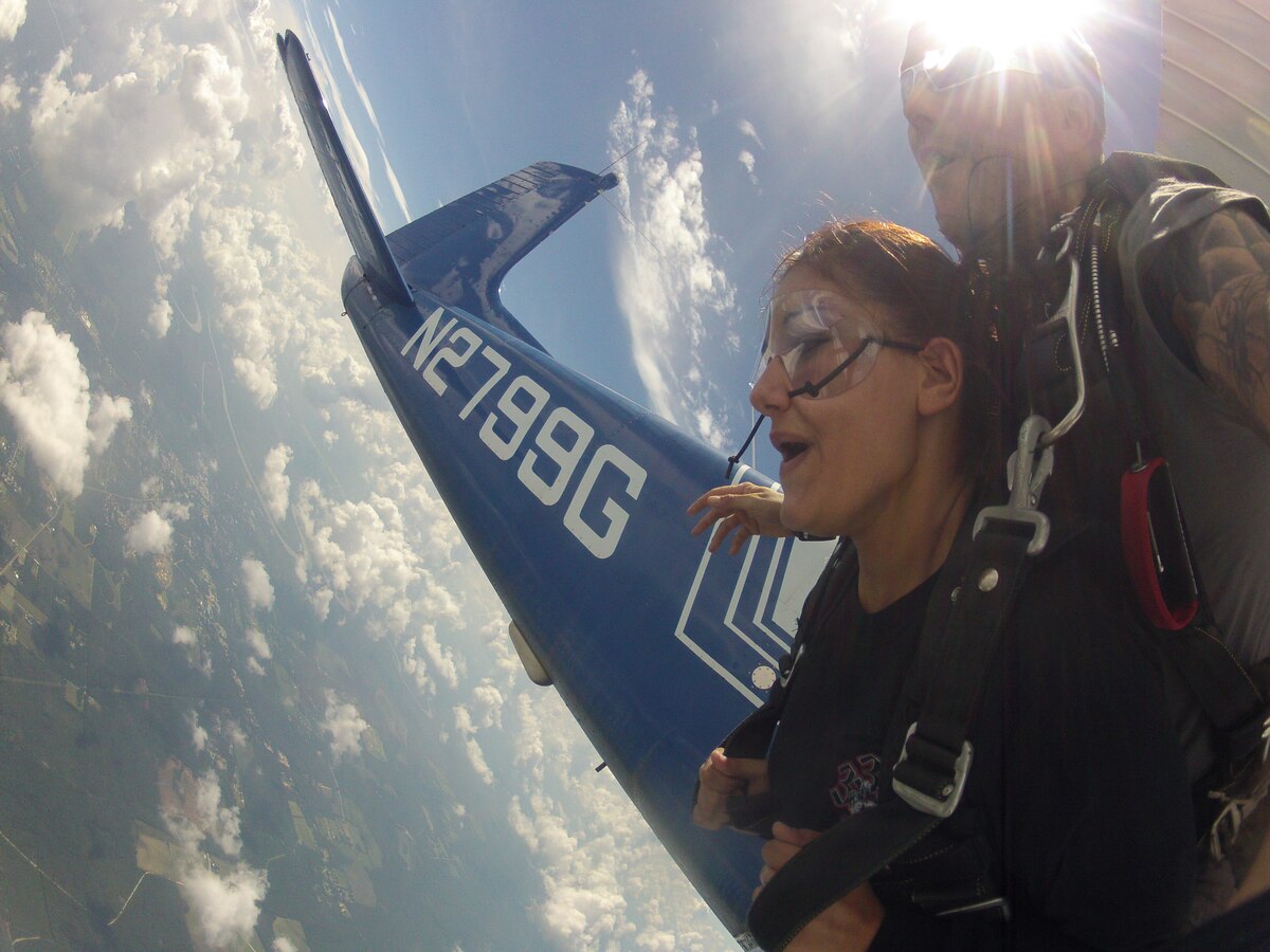 Airman 1st Class Drew Folks, a cyber-transport systems technician with 1st Special Operations Communications Squadron, skydives in tandem with an instructor of Skydive Panama City just above the center's runway during a trip to their station at Altha, Florida, July 27, 2013. For this 10,000 foot jump, Airmen and instructors fell for half that distance at speeds of 120 miles per hour before activiating their parachute. (Courtesy photo)
