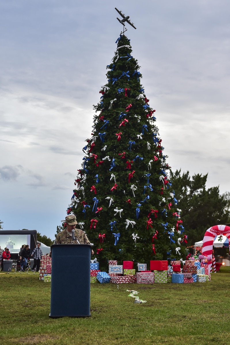 Col. Sean Farrell, the commander of the 1st Special Operations Wing, addresses Air Commandos and their families during the annual Christmas tree lighting ceremony at Hurlburt Field, Fla., Dec. 2, 2015. “The holidays are a time for all Air Commandos and their families to reflect on the blessings we share, particularly the peace we enjoy because of the selfless work and dedication of our armed forces and our Airmen.” Farrell said. “Let’s ask for one more blessing -- the safe return of all our deployed Airmen, may we focus all our thoughts on them, their families and each other during this wonderful holiday season.” (U.S. Air Force by Senior Airman Jeff Parkinson)