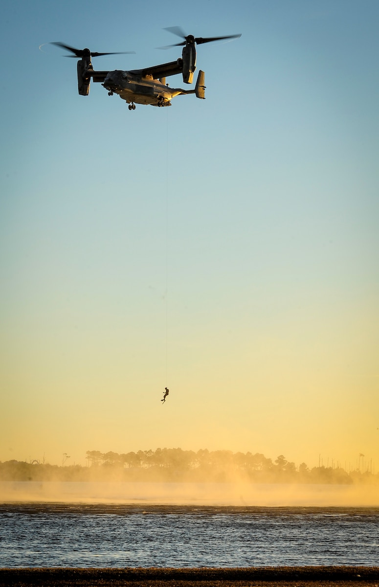 Pararescuemen with the 24th Special Operations Wing are lifted into a 8th Special Operations Squadron CV-22B Osprey during a demonstration at Hurlburt Field, Fla., Feb. 18, 2016. The demonstration showcased Air Force Special Operations Command capabilities for the John L. Hennessy Award evaluators as Hurlburt Field was named top nominee for the award. The Hennessy Award recognizes the best food service programs in the Air Force, as well as individual excellence. (U.S. Air Force photo by Senior Airman Meagan Schutter)