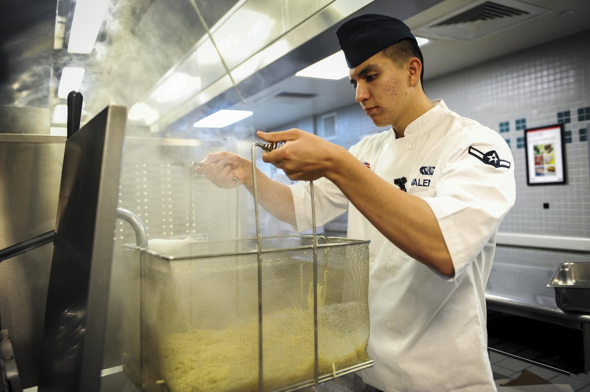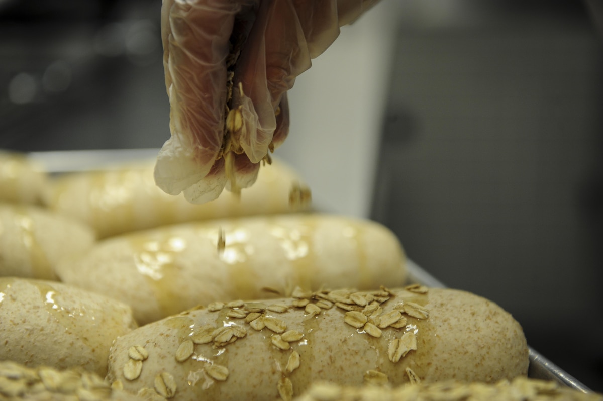Airman 1st Class Tyler Aguilar, a food service journeyman with the 1st Special Operations Force Support Squadron, prepares bread to be baked at The Reef, Hurlburt Field, Fla., March 28, 2016. Aguilar is The Reef dining facility’s food preparation cook, in charge of preparing the meat and bread served. (U.S. Air Force photo by Senior Airman Meagan Schutter)