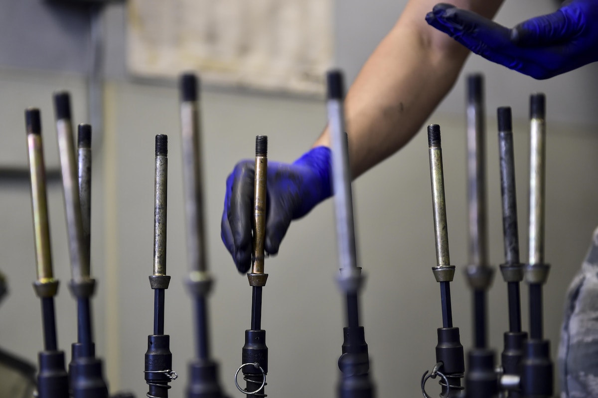 Senior Airman David Marzano and Senior Airman Shane Schubot, wheel and tire technicians with the 1st Special Operations Maintenance Squadron, place bolts on a C-130 nose wheel at Hurlburt Field, Fla., March 30, 2016. The wheel and tire technicians service tires for the AC-130U Spooky, MC-130H Combat Talon II, CV-22B Osprey and AC-130J Ghostrider. (U.S. Air Force photo by Senior Airman Jeff Parkinson)