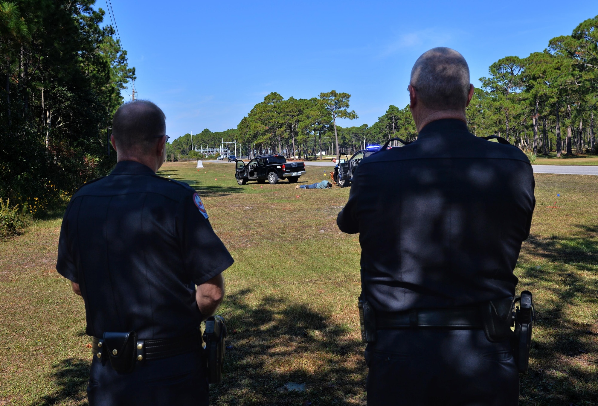 Capt. Tracy Heart, a detective with the Fort Walton Beach Police Department, left, and Chief Edward Ryan, chief of police with the FWB Police Department, watch a military working dog demonstration during a tour at Hurlburt Field, Fla., Nov. 1, 2016. The FWB officers visited the MWD section to see how the dogs are trained to take down offenders and detect explosives and narcotics. (U.S. Air Force photo by Senior Airman Andrea Posey)